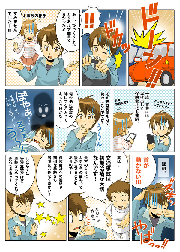 むち打ちは事故直後は平気だったのに、数日後から首や肩が痛いというケースが多く、レントゲンでは異常が見つからないということも少なくありません。